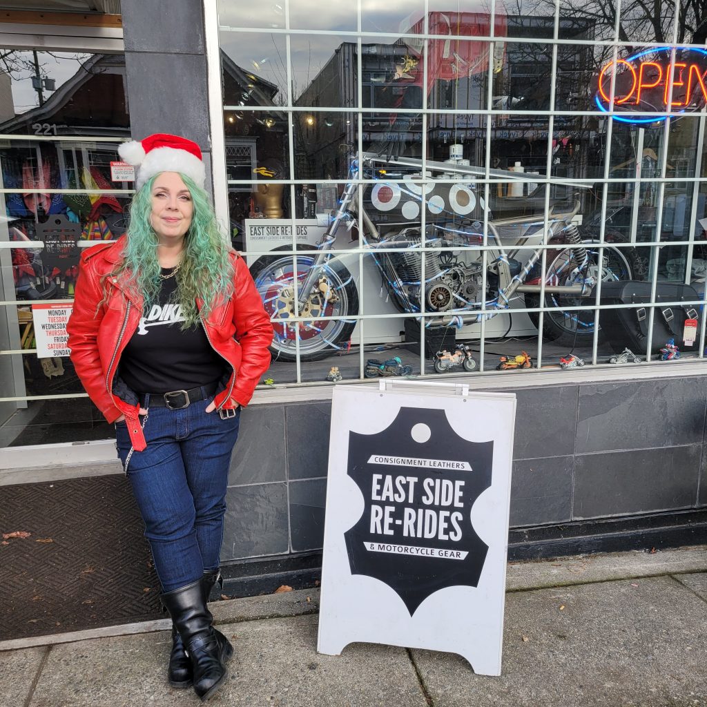 Hi, folks. I’m Elaine. I’m an elder leatherdyke, and have been enthusiastically active in the Vancouver leather community since the very early 90s. I’ve taught, run events, written kink columns, authored fiction, published magazines, run community websites, and lived and loved within our awesome queerly overlapping communities. From 2011 until my retirement (from retail) in November 2024, I ran East Side Re-Rides, Vancouver’s leather store.